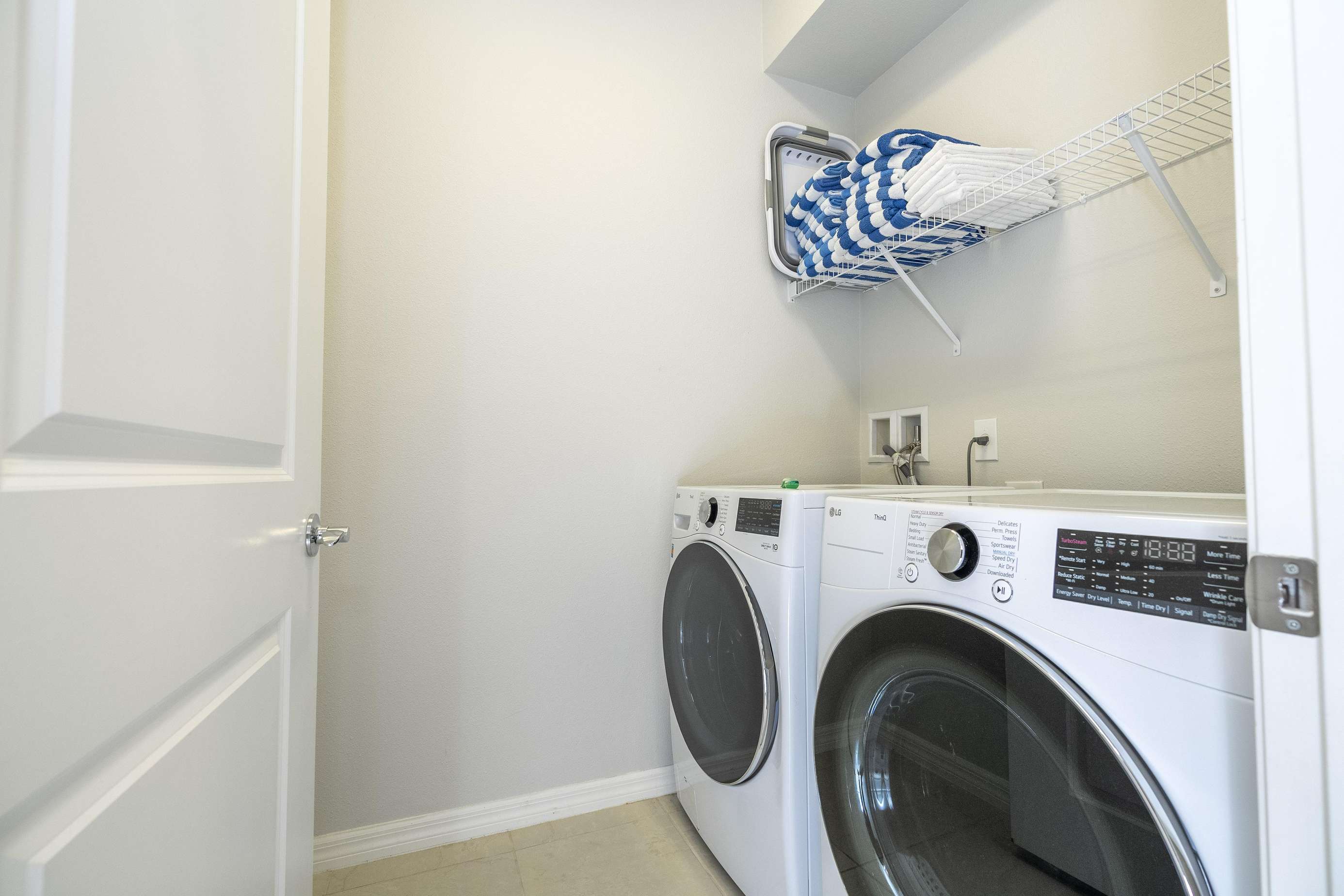 Laundry service available for linens, towels. No washcloths provided. Number of towels based on house capacity; no extras, guests may use washer/dryer.